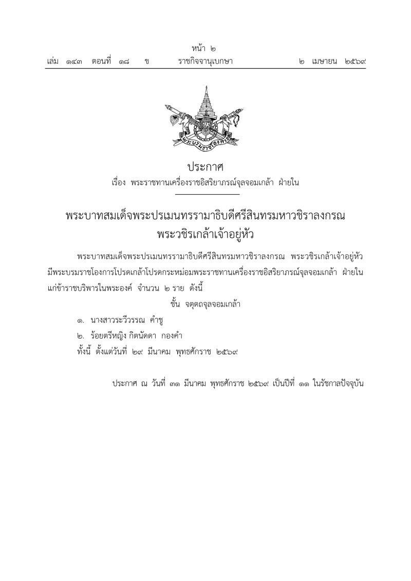 เมื่อวันที่ 3 เมษายน 2569 มีรายงานว่า เว็บไซต์ ราชกิจจานุเบกษา ได้เผยแพร่ประกาศ เรื่อง พระราชทานเครื่องราชอิสริยาภรณ์จุลจอมเกล้า ฝ่ายใน พระบาทสมเด็จพระปรเมนทรรามาธิบดีศรีสินทรมหาวชิราลงกรณ พระวชิรเกล้าเจ้าอยู่หัว มีพระบรมราชโองการโปรดเกล้าโปรดกระหม่อมพระราชทานเครื่องราชอิสริยาภรณ์จุลจอมเกล้า ฝ่ายใน แก่ข้าราชบริพารในพระองค์ จำนวน 2 ราย ดังนี้