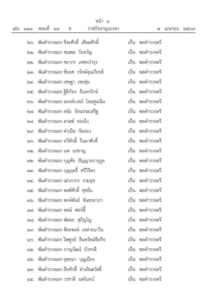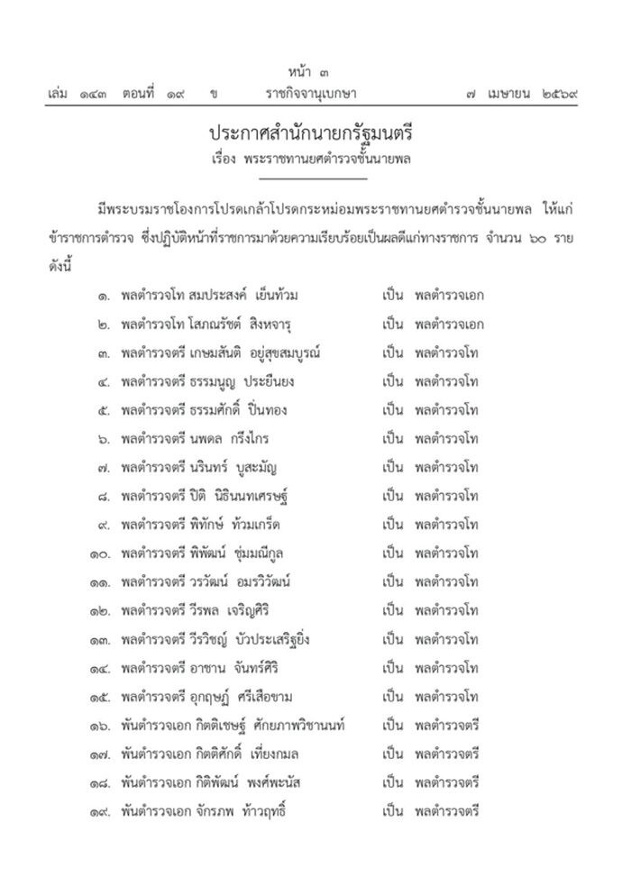 วันที่ 7 เมษายน 2569 เว็บไซต์ ราชกิจจานุเบกษา เผยแพร่ ประกาศสำนักนายกรัฐมนตรี เรื่อง พระราชทานยศตำรวจชั้นนายพล มีพระบรมราชโองการโปรดเกล้าโปรดกระหม่อม พระราชทานยศตำรวจชั้นนายพล ให้แก่ ข้าราชการตำรวจ ซึ่งปฏิบัติหน้าที่ราชการมาด้วยความเรียบร้อยเป็นผลดีแก่ทางราชการ จำนวน 60 ราย ดังนี้