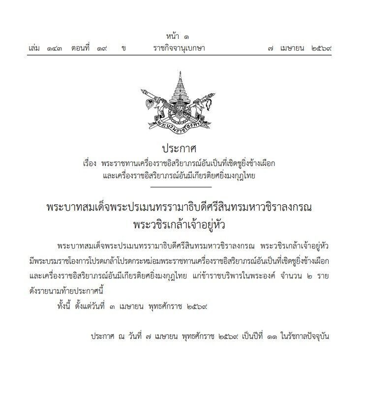 เว็บไซต์ ราชกิจจานุเบกษา เผยแพร่ประกาศเรื่อง พระราชทานเครื่องราชอิสริยาภรณ์อันเป็นที่เชิดชูยิ่งช้างเผือก และเครื่องราชอิสริยาภรณ์อันมีเกียรติยศยิ่งมงกุฎไทย ความว่า