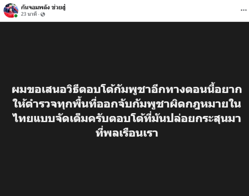 ล่าสุด กัน จอมพลัง นักเคลื่อนไหวชื่อดัง ได้ออกมาแสดงท่าทีต่อเหตุการณ์นี้ผ่านโพสต์สาธารณะ โดยเสนอให้เจ้าหน้าที่ตำรวจในทุกพื้นที่เร่งดำเนินคดีกับชาวกัมพูชาที่กระทำผิดกฎหมายภายในไทยอย่างเข้มงวด เพื่อเป็นการตอบโต้กรณีที่มีการยิงปืนใส่ประชาชนไทยโดยตรง