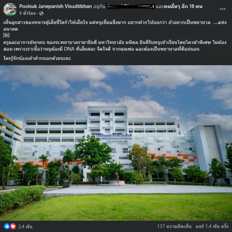 ครูและอาจารย์ทุกคน ของรร.พยาบาลรามาธิบดี มหาวิทยาลัย มหิดล ยินดีรับหนูเข้าเรียนโดยโควต้าพิเศษ ไม่ต้องสอบ เพราะเราเชื่อว่าหนูต้องมี DNA ที่เสียสละ จิตใจดี จากคุณพ่อ และต้องเป็นพยาบาลที่ดีแน่นอน ใครรู้จักน้องเค้าฝากบอกด้วยนะคะ