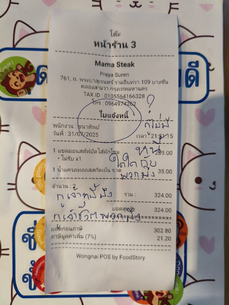 เมื่อวันที่ 1 สิงหาคม 2568 ร้าน Mama Steak ย่านพระยาสุเรนทร์ ได้โพสต์เรื่องราวสุดช็อกที่กลายเป็นประเด็นถกเถียงในโลกออนไลน์ หลังจากมีลูกค้าแสดงความไม่พอใจอย่างรุนแรงกับคำว่า ใบแจ้งหนี้ บนใบรายการอาหารสำหรับคิดเงิน