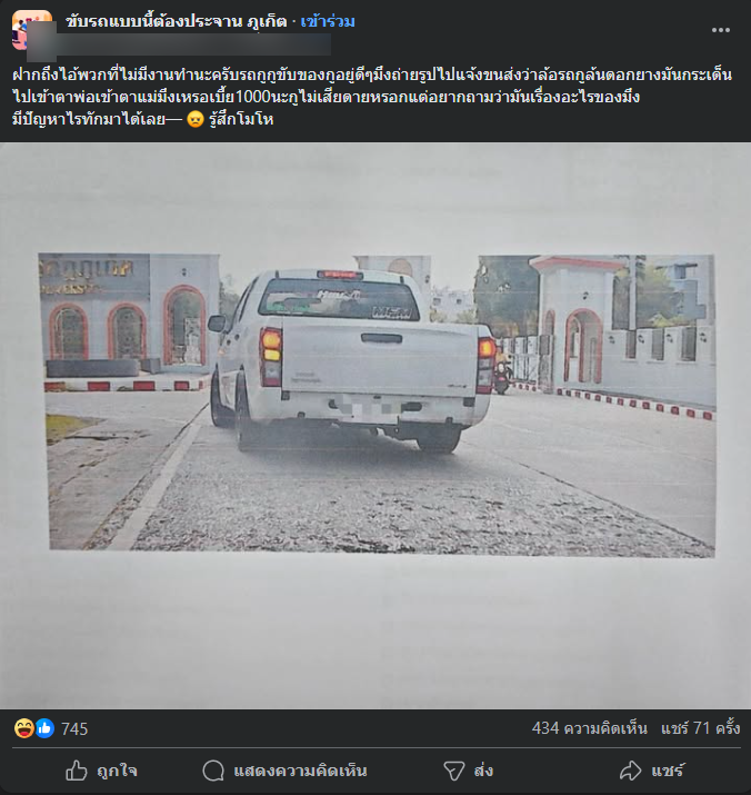 ต้องบอกเลยว่ากลายเป็นประเด็นร้อนขึ้นมาทั้นที เมื่อผู้ใช้เฟซบุ๊กรายหนึ่งได้โพสต์ภาพใบค่าปรับลงในกลุ่ม ขับรถแบบนี้ต้องประจาน ภูเก็ตพร้อมข้อความแสดงความไม่พอใจอย่างรุนแรง หลังถูกบุคคลปริศนาแจ้งเรื่องไปยังกรมการขนส่งทางบกว่ารถยนต์ของตนเองมีการดัดแปลงสภาพผิดกฎหมาย