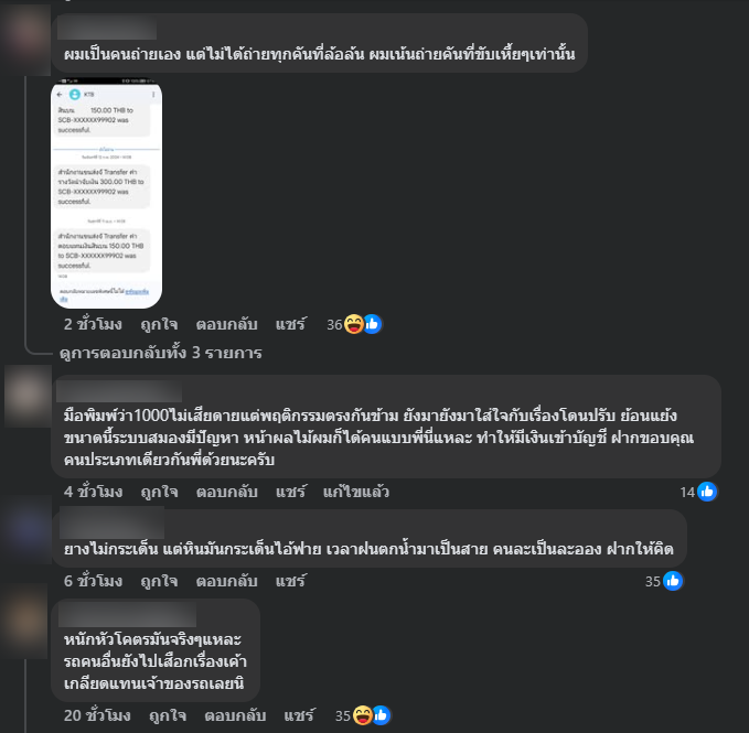 เจ้าของรถระบุข้อความว่า ฝากถึงไอ้พวกที่ไม่มีงานทำนะครับ รถกูกูขับของกูอยู่ดี ๆ มึงถ่ายรูปไปแจ้งขนส่งว่าล้อรถกูล้นเบี้ย 1,000 นะ กูไม่เสียดายหรอก แต่อยากถามว่ามันเรื่องอะไรของมึง โพสต์ดังกล่าวทำให้เกิดกระแสวิพากษ์วิจารณ์อย่างกว้างขวาง โดยมีทั้งผู้ที่เห็นใจและไม่เห็นด้วย