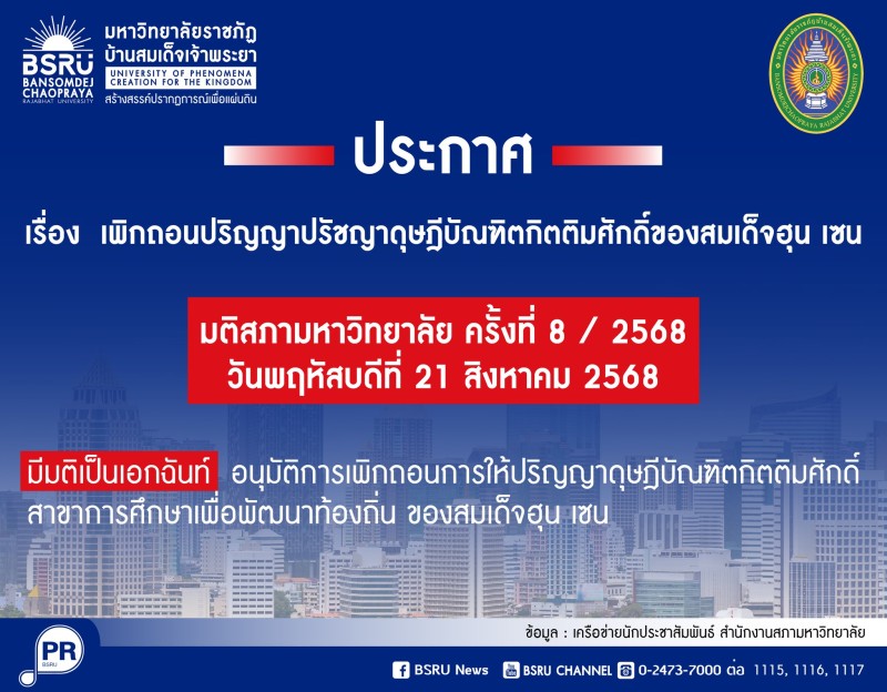 เมื่อวันที่ 22 สิงหาคม 2568 ที่ผ่านมา มหาวิทยาลัยราชภัฏบ้านสมเด็จเจ้าพระยา มีประกาศเพิกถอนปริญญาปรัชญาดุษฎีบัณฑิตกิตติมศักดิ์ ที่เคยมอบให้แก่สมเด็จฮุน เซน ประธานวุฒิสภาและอดีตนายกรัฐมนตรีกัมพูชา ผ่าน เพจเฟซบุ๊ก BSRU News โดยได้ระบุไว้ตามประกาศที่เเนบมาพร้อมนี้