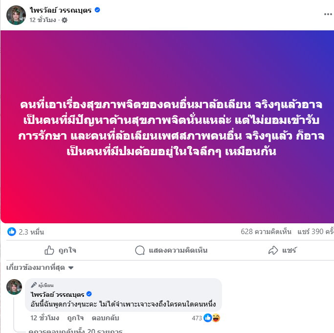 พร้อมทั้งเสริมในคอมเม้นว่า อันนี้ฉันพูดกว้างๆนะคะ ไม่ได้จำเพาะเจาะจงถึงใครคนใดคนหนึ่ง