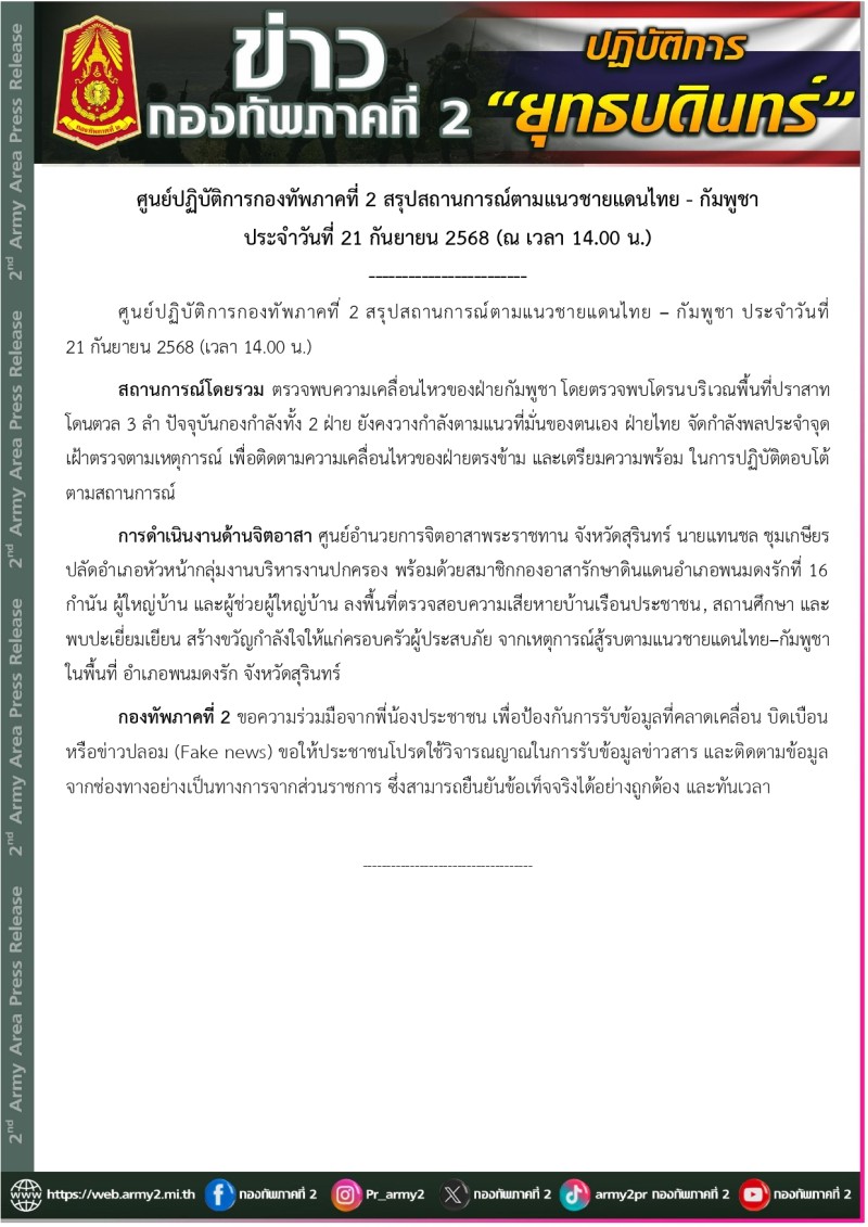 วันที่ 21 กันยายน 2568 ศูนย์ปฏิบัติการ กองทัพภาคที่ 2 สรุปสถานการณ์ตามแนวชายแดนไทย-กัมพูชา ประจำวันที่ 21 กันยายน 2568 (ณ เวลา 14.00 น.)