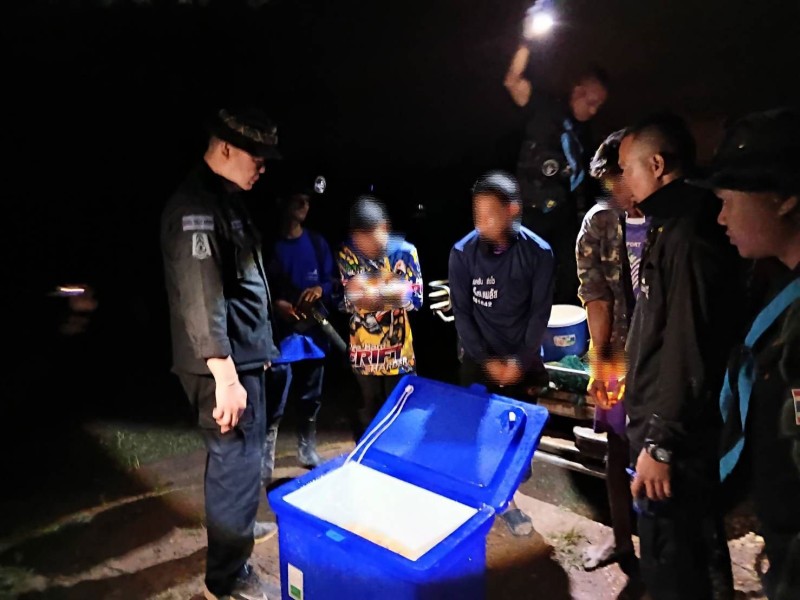 เวลา 03.50 น. ขณะเจ้าหน้าที่ลาดตระเวนมาถึงบริเวณถนนการเกษตร พื้นที่บ้านเหล่าหลวง ตำบลดงบัง พบชาย 3 คนกำลังช่วยกันเข็นรถสามล้อเครื่องที่ติดหล่มอยู่ โดยบนรถมีถังน้ำแข็งสีน้ำเงินและอุปกรณ์หาปลาจำนวนหนึ่ง เจ้าหน้าที่จึงเข้าให้ความช่วยเหลือ แต่พบพิรุธจึงขอทำการตรวจค้น