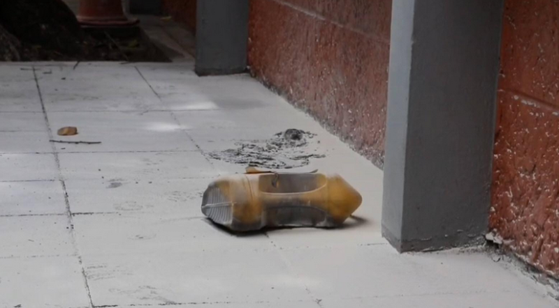 จากการตรวจสอบ พบคราบสารเคมีจากถังดับเพลิงอยู่เต็มทางเท้าหลังป้ายรถเมล์หน้ากรมพัฒนาที่ดิน พร้อมถังน้ำมันเชื้อเพลิงสีเหลืองความจุประมาณ 6 ลิตร และไฟแช็กตกอยู่ในที่เกิดเหตุ