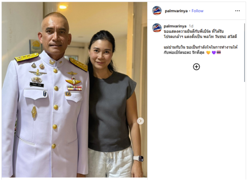 พร้อมข้อความสุดหวาน ร่วมเเสดงความยินดีกับสามี ผ่านอินสตาเเกรม palmvarinya โดยระบุว่า ขอแสดงความยินดีกับพี่เบิร์ด ที่ได้รับโปรดเกล้าฯ แต่งตั้งเป็น พลโท วันชนะ สวัสดี แม่ปามกับวินขอเป็นกำลังใจในการทำงานให้กับพ่อเบิร์ดนะคะ รักที่สุด