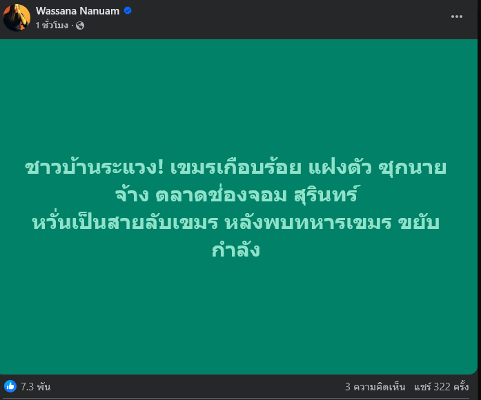วันที่ 3 ตุลาคม 2568 มีรายงานว่า เฟซบุ๊ก Wassana Nanuam หรือที่เรารู้จักกันดีในนาม วาสนา นาน่วม ผู้สื่อข่าวสายทหาร ได้โพสต์ข้อความระบุว่า ชาวบ้านระแวง! เขมรเกือบร้อย แฝงตัว ซุกนายจ้าง ตลาดช่องจอม สุรินทร์ หวั่นเป็นสายลับเขมร หลังพบทหารเขมร ขยับกำลัง