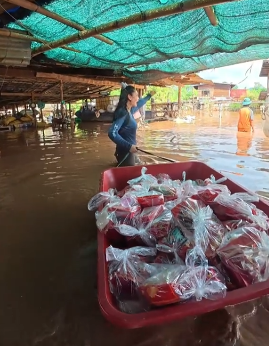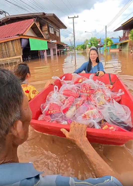 โดยเธอลุยน้ำตามบ้านต่างๆ นำอาหารและขนมจากร้านของตัวเองไปแจกจ่ายให้ชาวบ้านที่ได้รับผลกระทบ เธอเล่าว่าสาเหตุที่ตัดสินใจมาช่วย เพราะเห็นข่าวชาวบ้านเดือดร้อน บางพื้นที่ระดับน้ำสูงเกือบถึงอก การเดินทางออกไปซื้อของกินลำบากมาก เธอจึงอยากมาเป็นอีกหนึ่งกำลังใจ และช่วยเหลือเท่าที่ทำได้