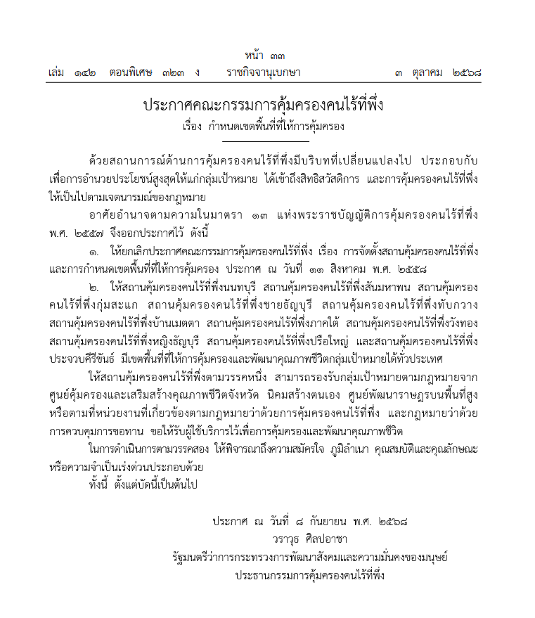 ประกาศ ณ วันที่ 8 กันยายน พ.ศ. 2568 โดยมี นาย วราวุธ ศิลปอาชา รัฐมนตรีว่าการกระทรวงการพัฒนาสังคมและความมั่นคงของมนุษย์ ประธานกรรมการคุ้มครองคนไร้ที่พึ่ง เป็นผู้ลงนาม