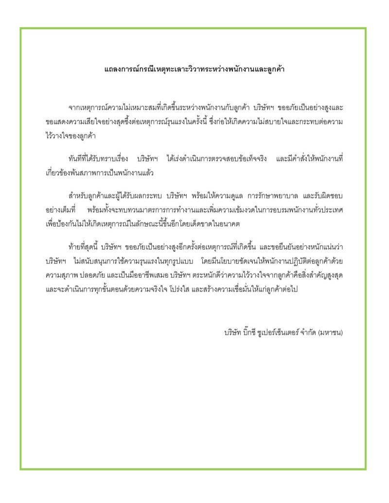 ท้ายที่สุดนี้ บริษัทฯ ขออภัยเป็นอย่างสูงอีกครั้งต่อเหตุการณ์ที่เกิดขึ้น และขอยืนยันอย่างหนักแน่นว่าบริษัทฯ ไม่สนับสนุนการใช้ความรุนแรงในทุกรูปแบบ โดยมีนโยบายชัดเจนให้พนักงานปฏิบัติต่อลูกค้าด้วยความสุภาพ ปลอดภัย และเป็นมืออาชีพเสมอ บริษัทฯ ตระหนักดีว่าความไว้วางใจจากลูกค้าคือสิ่งสำคัญสูงสุดและจะดำเนินการทุกขั้นตอนด้วยความจริงใจ โปร่งใส และสร้างความเชื่อมั่นให้แก่ลูกค้าต่อไป
