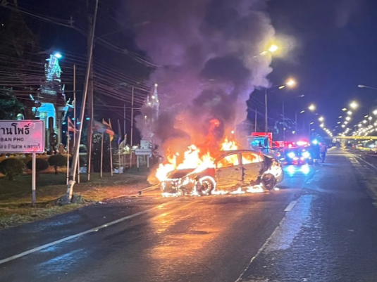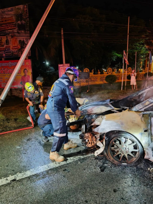 เมื่อเวลา 23.03 น. ของวันที่ 4 ตุลาคม 2568 ที่ผ่านมา ศูนย์รับแจ้งเหตุฉุกเฉิน 191 ตำรวจภูธรจังหวัดเพชรบุรี ได้รับแจ้งเกิดอุบัติเหตุรถยนต์เก๋งเสียหลักชนเสาไฟฟ้าส่องสว่าง บริเวณหน้าวัดท่าไชยศิริ ถนนเพชรเกษม (ขาเข้า กรุงเทพฯ) เลนคู่ขนาน อำเภอบ้านลาด จังหวัดเพชรบุรี ส่งผลให้มีผู้ได้รับบาดเจ็บและเกิดเพลิงลุกไหม้อย่างรุนแรง เจ้าหน้าที่ตำรวจ สภ.บ้านลาด หน่วยดับเพลิง อบต.ต้นมะม่วงและอาสาสมัครกู้ภัยมูลนิธิสว่างสรรเพชญธรรมสถาน จังหวัดเพชรบุรี รุดเข้าตรวจสอบ