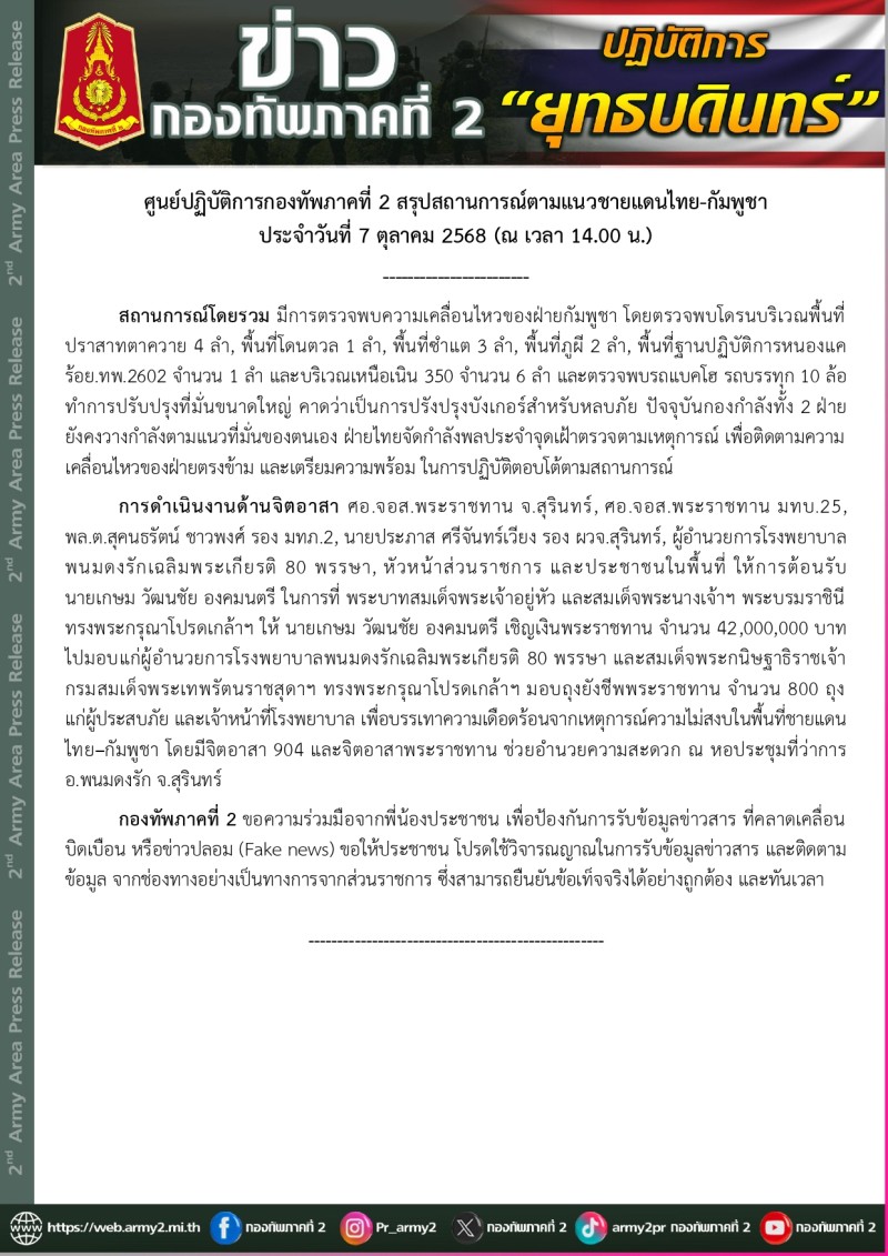 วันที่ 7 ตุลาคม 2568 ศูนย์ปฏิบัติการกองทัพภาคที่ 2 สรุปสถานการณ์ตามแนวชายแดนไทย-กัมพูชา (ณ เวลา 14.00 น.)