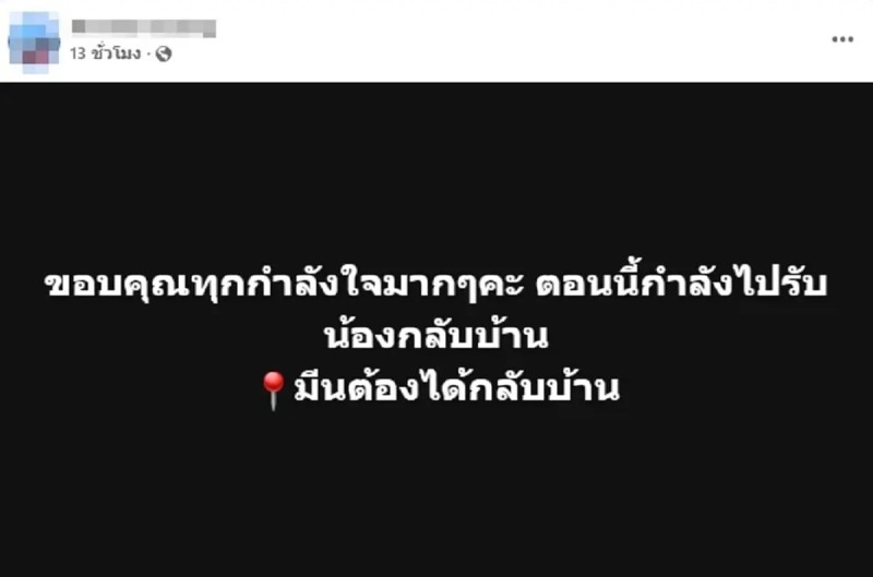 ล่าสุดวันนี้ พี่สาวของน้องมีน ได้โพสต์ผ่านเฟซบุ๊ก ขอบคุณทุกกำลังใจ พร้อมระบุว่า ตอนนี้กำลังไปรับน้องกลับบ้าน มีนต้องได้กลับบ้าน