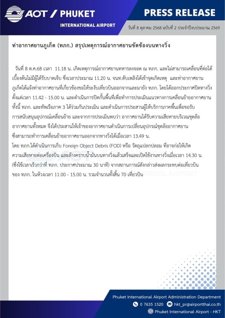 เมื่อเวลา 15.40 น. วันที่ 8 ตุลาคม 2568 มีรายงานข่าวจากท่าอากาศยานภูเก็ต (ทภก.) แจ้งว่า เมื่อเวลา 11.18 น. เกิดเหตุอากาศยานของกองทัพลงจอดที่ท่าอากาศยานภูเก็ตแล้วไม่สามารถเคลื่อนที่ต่อได้ โดยเบื้องต้นไม่มีรายงานผู้ได้รับบาดเจ็บ หลังเกิดเหตุเจ้าหน้าที่ดับเพลิงของท่าอากาศยานได้เข้าพื้นที่ในเวลา 11.20 น. เพื่อควบคุมสถานการณ์