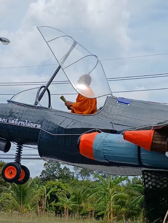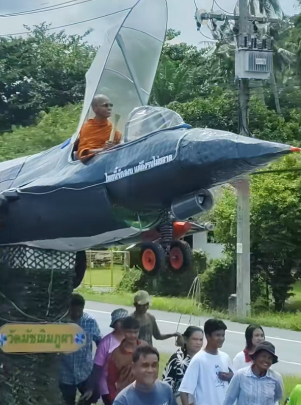 ไม่ใช่แค่ลากมาเฉยๆ เพราะบนเครื่องบินยังมีพระนั่งประทับอยู่ พร้อมโชว์ลีลารดน้ำไปด้วยแบบชิลๆ งานนี้ทั้งขำทั้งงงว่า นี่คือเครื่องบินบิณฑบาตหรือไง