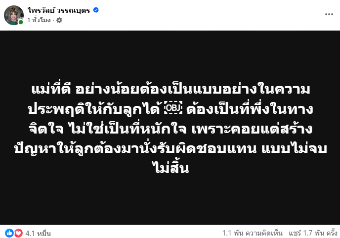 เมื่อวันที่ 9 ตุลาคม 2568 กรณีที่ แพรรี่ ไพรวัลย์ วรรณบุตร อินฟลูเอนเซอร์ชื่อดัง ได้โพสต์ข้อความแสดงความคิดเห็นอย่างเผ็ดร้อนและตรงไปตรงมาเกี่ยวกับคุณสมบัติของ แม่ที่ดี จนกลายเป็นประเด็นที่ถูกแชร์และวิพากษ์วิจารณ์อย่างกว้างขวางในโลกโซเชียลมีเดีย