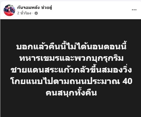 ด้าน กัน จอมพลัง ได้ออกมาโพสต์ถึงเหตุการณ์ที่เกิดขึ้น โดยระบุอย่างชัดเจนว่า บอกแล้วคืนนี้ไม่ได้นอน ตอนนี้ทหารเขมรและพวกบุกรุกริมชายแดนสระแก้วกลัวขึ้นสมองวิ่งโกยแน่บไปตามถนนประมาณ 40 คน สนุกทั้งคืน เป็นการตอกย้ำถึงความสำเร็จของปฏิบัติการที่ทำให้ผู้บุกรุกยอมจำนนต่อแรงกดดันทางจิตวิทยาและล่าถอยออกไป