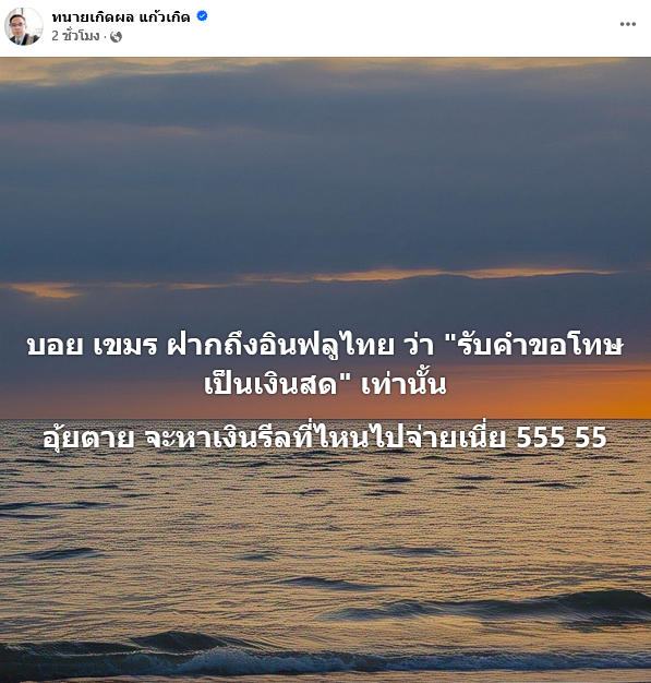ล่าสุด วันที่ 11 ตุลาคม 2568 นายเกิดผล เเก้วเกิด ทนายดัง ได้ออกมาโพสต์ข้อความ ผ่านเฟซบุ๊กส่วนตัว ทนายเกิดผล แก้วเกิด โดยระบุว่า บอย เขมร ฝากถึงอินฟลูไทย ว่า รับคำขอโทษเป็นเงินสด เท่านั้น อุ้ย จะหาเงินรีลที่ไหนไปจ่ายเนี่ย 55555