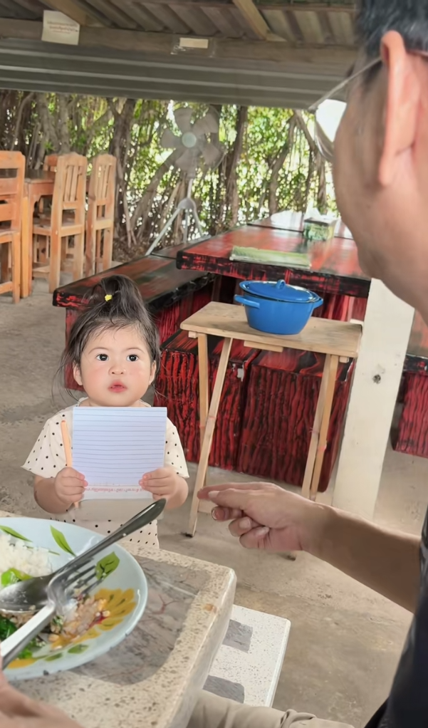 หลังจากนิ่งคิดอยู่พักหนึ่ง ลูกสาวก็ทำท่าทางเหมือนกำลังเขียนอะไรบางอย่างลงบนกระดาษ ก่อนจะหันมาให้คุณพ่อคุณแม่เห็น ซึ่งพอเห็นเท่านั้นแหละ ทุกคนก็กลั้นขำไว้ไม่อยู่ เพราะในกระดาษเต็มไปด้วยรอยขีดเขียนเลอะเทอะ อ่านไม่ออกเลยว่าเขียนว่าอะไร เรียกได้ว่าเป็นโมเมนต์น่ารักที่ทำเอาหัวใจละลายเลยทีเดียว