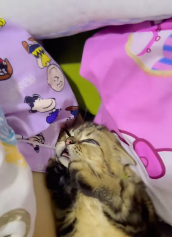 ในคลิป เจ้าแมวกำลังนอนหลับพร้อมดูดขวดนมไปด้วยน่ารักสุดๆ จนคุณแม่อยากแกล้งเลยเอาขวดนมออก แล้วน้องก็ยังไม่รู้ตัวนอนหลับปากค้างกันไปเลย จนคุณแม่เห็นก็อดขำไม่ไหว