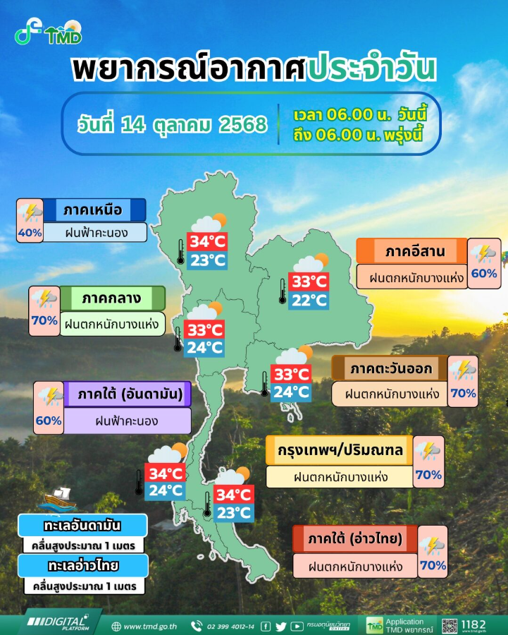 วันที่ 14 ต.ค.2568 กรมอุตุนิยมวิทยา พยากรณ์อากาศ 24 ชั่วโมงข้างหน้า ภาคตะวันออกเฉียงเหนือ ภาคกลางตอนล่าง รวมทั้งกรุงเทพมหานครและปริมณฑล ภาคตะวันออก และภาคใต้มีฝนตกหนักบางพื้นที่