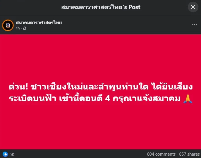 โดย เพจเฟซบุ๊ก สมาคมดาราศาสตร์ไทย ได้โพสต์ข้อความแจ้งด่วนเมื่อช่วงเช้าของวันเดียวกัน ระบุว่า ชาวเชียงใหม่และลำพูนท่านใด ได้ยินเสียงระเบิดบนฟ้า เช้านี้ตอนตี 4 กรุณาแจ้งสมาคม พร้อมแจ้งทิศทางและข้อมูลเพิ่มเติม หากพบเห็นลูกไฟบนท้องฟ้า ซึ่งในเบื้องต้น เจ้าหน้าที่คาดว่าอาจเป็น ดาวตกขนาดใหญ่ หรือปรากฏการณ์จากวัตถุอวกาศเข้าสู่ชั้นบรรยากาศของโลก
