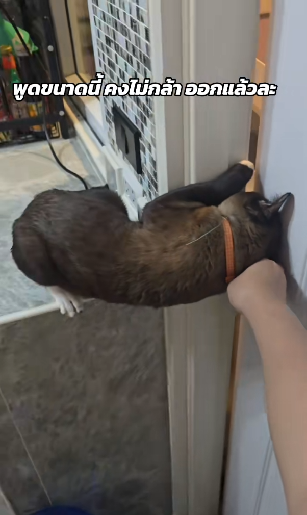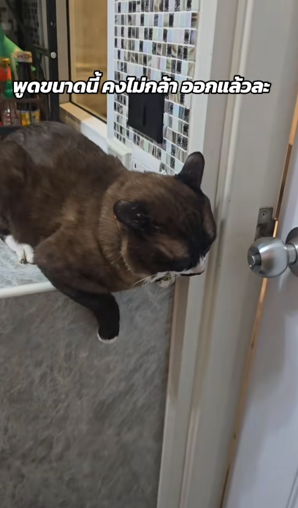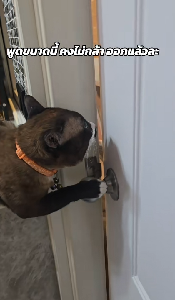 ในคลิปเจ้าเหมียวที่ดูเหมือนยังคงมีความเคยชินกับการใช้ชีวิตนอกบ้าน มันพยายามใช้หัวดันประตูเพื่อออกไปข้างนอก ทำเอาคุณแม่เจ้าของต้องรีบจับประตูไว้แน่น พร้อมดุแบบขำๆว่า อยากออกก็ออกไปเลย มาขอข้าวก็จะไม่ให้กินแล้วนะ ไม่ต้องกลับเข้ามาอีก