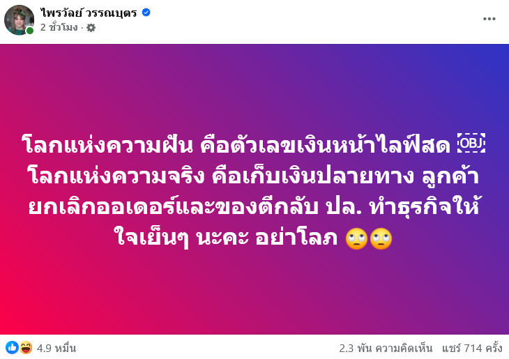 เพราะล่าสุด ไพรวัลย์ วรรณบุตร หรือที่เราเรียกติดปากกันว่า เเพรรี่ ได้ออกมาโพสต์ข้อความเตือนสติชาวเน็ตทุกคน พร้อมฝากถึงเจ้าของธุรกิจวงการไลฟ์สด ผ่านเฟซบุ๊ก ไพรวัลย์ วรรณบุตร โดยระบุว่า โลกแห่งความฝัน คือตัวเลขเงินหน้าไลฟ์สด โลกแห่งความจริง คือเก็บเงินปลายทาง ลูกค้ายกเลิกออเดอร์และของตีกลับ ปล. ทำธุรกิจให้ใจเย็น ๆ นะคะ อย่าโลภ