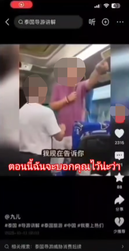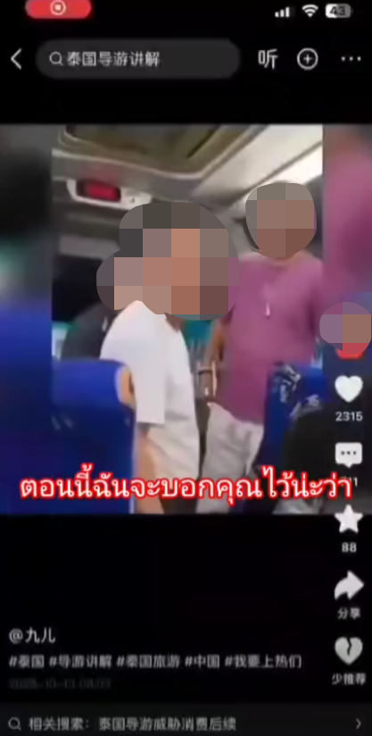 ในคลิปปรากฏภาพชายชาวต่างชาติรายหนึ่ง ซึ่งถูกระบุว่าเป็น ไกด์เถื่อน ยืนถือไมโครโฟนบนรถบัสนักท่องเที่ยวชาวจีน พูดตำหนินักท่องเที่ยวเสียงดังเนื่องจากไม่ยอมซื้อสินค้าจากร้านค้าที่พาไป พร้อมกล่าวหาว่าเป็นการ ไม่ให้เกียรติไกด์ และข่มขู่ว่าหากไม่ให้ความร่วมมือ จะไม่ให้เดินทางกลับประเทศจีนได้ สถานการณ์เริ่มตึงเครียดเมื่อไกด์รายนี้สังเกตเห็นว่ามีผู้โดยสารคนหนึ่งกำลังบันทึกคลิปเหตุการณ์ดังกล่าว จึงพยายามเข้าขัดขวางและสั่งให้ลบคลิปทันที ต่อมากระแสสังคมออนไลน์ได้แสดงความไม่พอใจเป็นจำนวนมาก โดยมองว่าเป็นการละเมิดสิทธิของนักท่องเที่ยวอย่างร้ายแรง และกระทบต่อภาพลักษณ์ของการท่องเที่ยวไทย