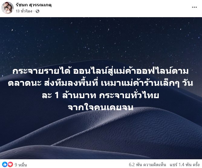 ล่าสุด เจนนี่ ได้โพสต์ข้อความอีกครั้ง ผ่านเฟซบุ๊กส่วนตัว รัชนก สุวรรณเกตุ โดยระบุว่า กระจายรายได้ ออนไลน์สู่แม่ค้าออฟไลน์ตามตลาดนะ ส่งทีมลงพื้นที่ เหมาแม่ค้าร้านเล็ก ๆ วันละ 1 ล้านบาท กระจายทั่วไทย จากใจคนเคยจน