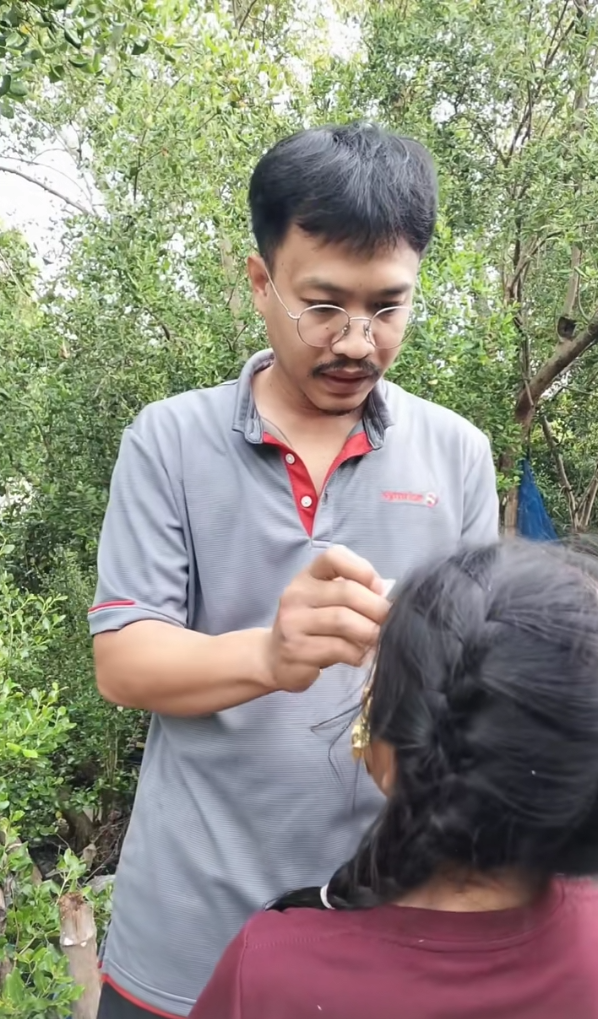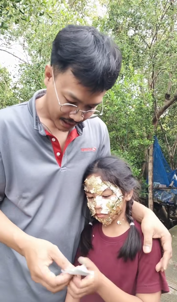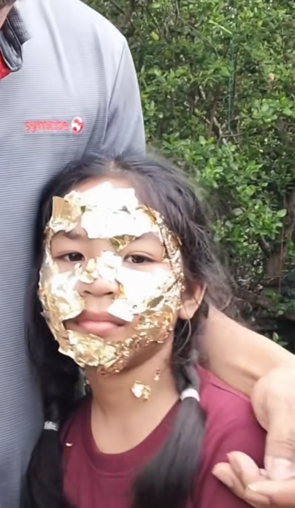 แต่จังหวะพีคก็มาถึง เมื่อคุณพ่อหยิบ ทอง ออกมาไม่ใช่สร้อยทองหรือทองแท่ง อย่างที่ใครๆ คาดหวัง แต่เป็น ทองคำเปลว ใช่แล้ว ทองคำเปลวแผ่นบางๆ ที่ปกติเอาไว้แปะพระนั่นเอง คราวนี้คุณพ่อติดไปทั่วหน้าลูกสาว จนเห็นแค่ดวงตาโผล่ออกมาเท่านั้น
