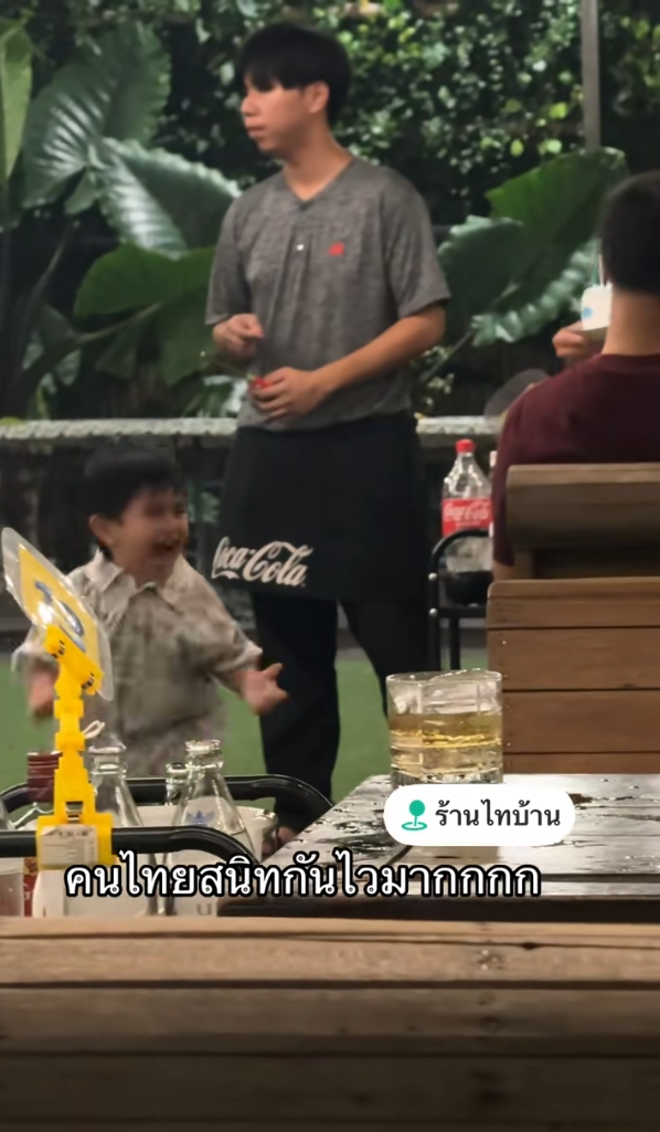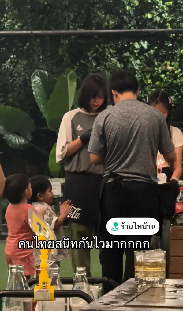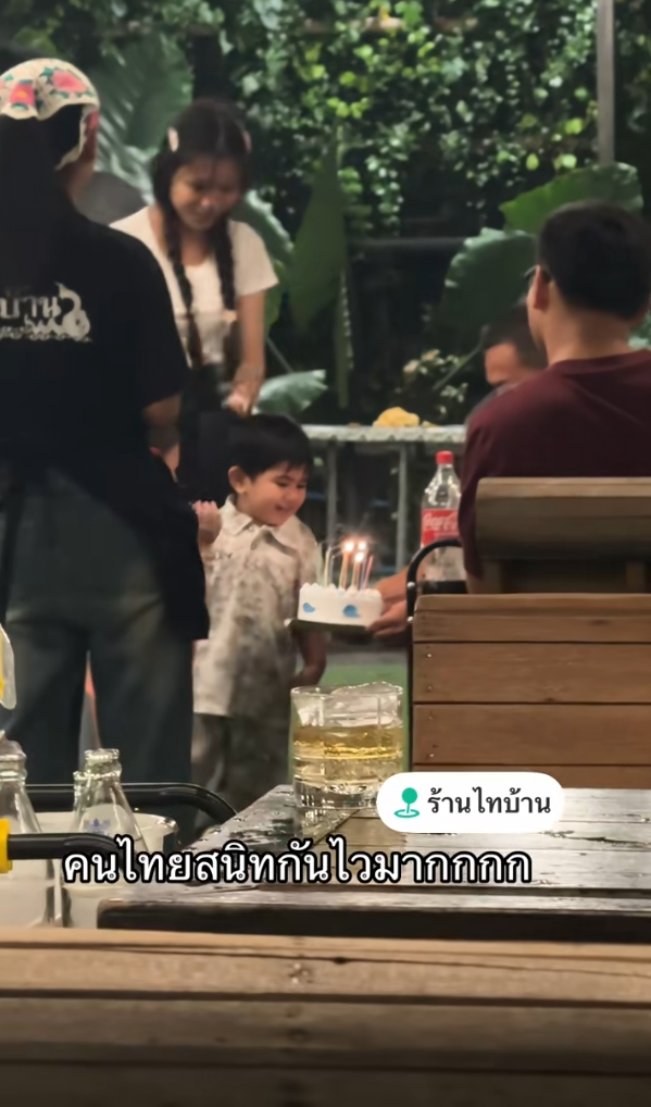 เมื่อเห็นบรรยากาศสนุกสนาน เด็กทั้งสองจึงเดินเข้าไปร่วมร้องเพลงและปรบมืออย่างตื่นเต้น ราวกับรู้จักเจ้าของวันเกิดมาก่อน และที่น่ารักไปกว่านั้นคือ เมื่อถึงช่วงเป่าเทียน เจ้าของวันเกิดก็ใจดีอนุญาตให้เด็กๆ ร่วมเป่าเทียนบนเค้กด้วยกัน