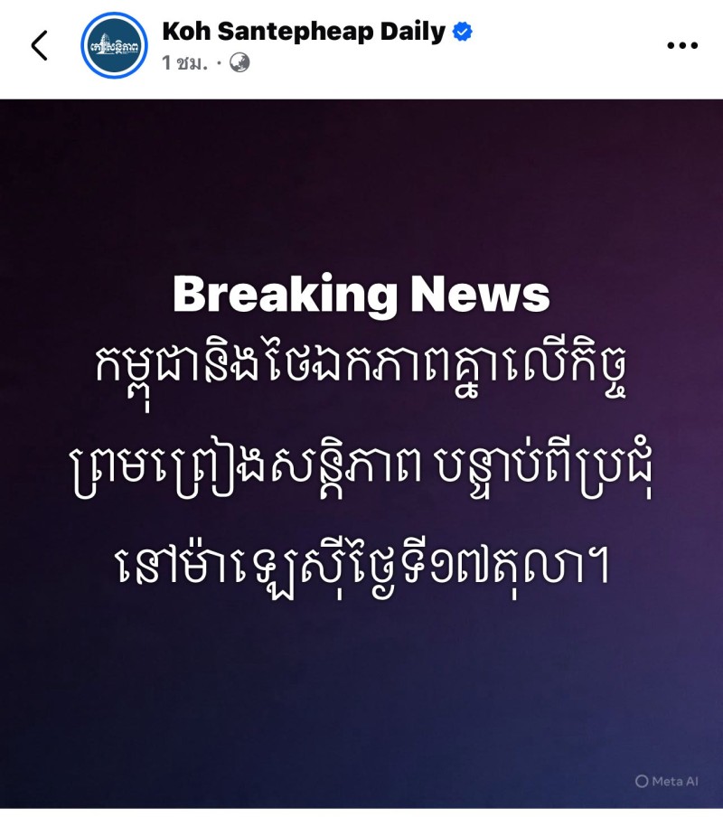 กัมพูชาและไทยตกลงร่วมกันในร่างเอกสารว่าด้วยข้อตกลงสันติภาพ เพื่อให้ลงนามโดยนายกรัฐมนตรีของทั้งสองประเทศ ในการประชุมสุดยอดอาเซียน โดยมีโดนัลด์ ทรัมป์ และประธานอาเซียนเป็นพยาน