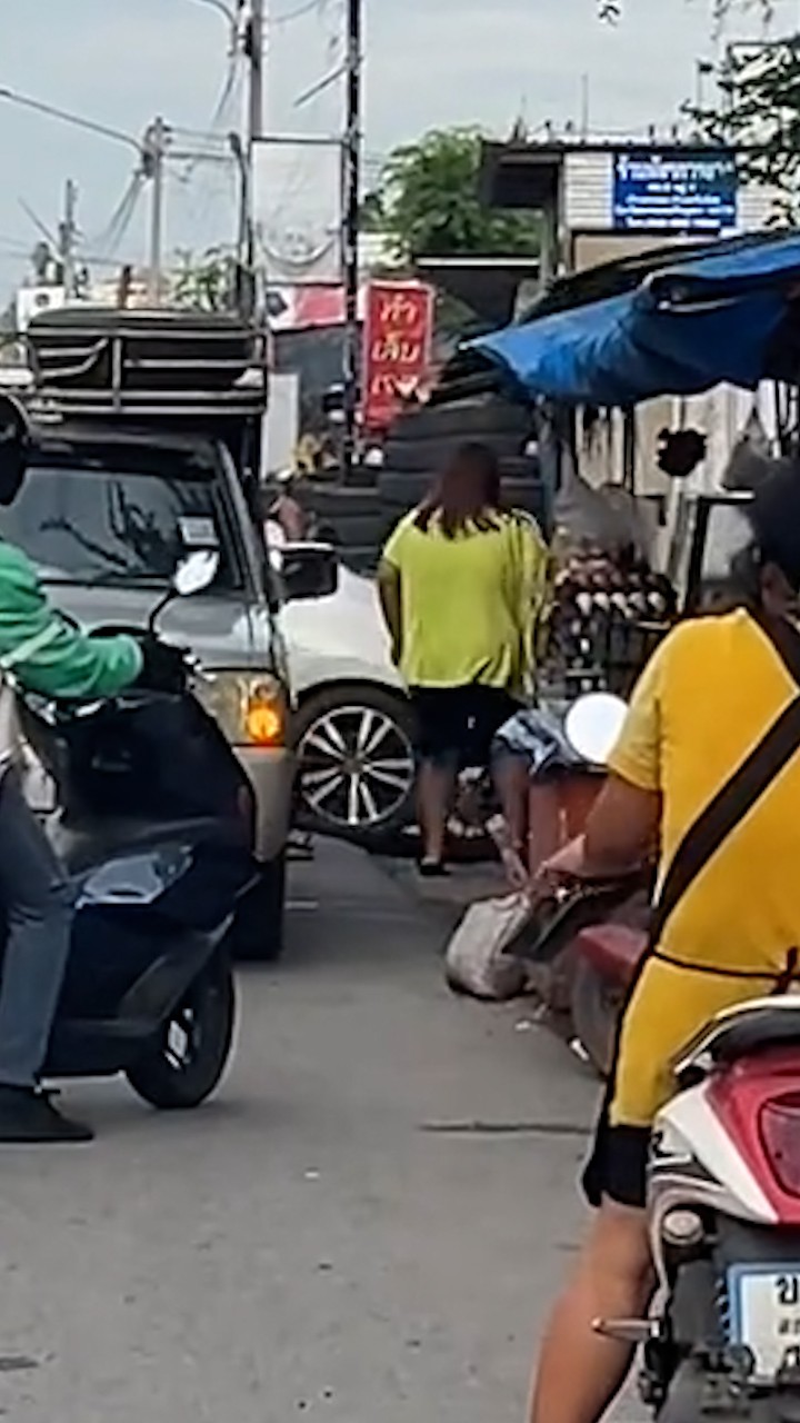 ในคลิปรถเก๋งและรถจักรยานยนต์ขับขี่อยู่ในเลนเดียวกัน ก่อนเกิดปากเสียงอย่างรุนแรง ทันใดนั้น รถเก๋งได้ถอยหลังพุ่งชนรถจักรยานยนต์อย่างจัง แล้วเสียหลักพุ่งเข้าไปในร้านหมูปิ้งริมทาง ทำให้ลูกค้าที่อยู่บริเวณนั้นต่างพากันแตกตื่นหนีเอาตัวรอด ฝั่งรถเก๋งอ้างโดนถุยน้ำลายใส่ก่อน ด้านเจ้าหน้าที่จาก อบต.พยอม ได้นำรถพยาบาลเข้าช่วยเหลือผู้บาดเจ็บอย่างทันท่วงที