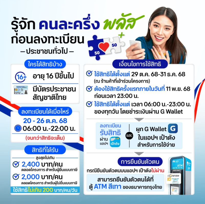 วันที่ 20 ต.ค.2568 สำหรับโครงการ คนละครึ่งพลัส เปิดให้ลงทะเบียนแล้วตั้งแต่เวลา 06.00-22.00 น. วันที่ 20-26 ต.ค.2568 โดยเพจเฟซบุ๊ก Krungthai Care โพสต์ข้อความถึงเรื่องต้องรู้ ก่อนลงทะเบียนคนละครึ่งพลัส สำหรับประชาชนทั่วไป โดยมีรายละเอียดดังนี้