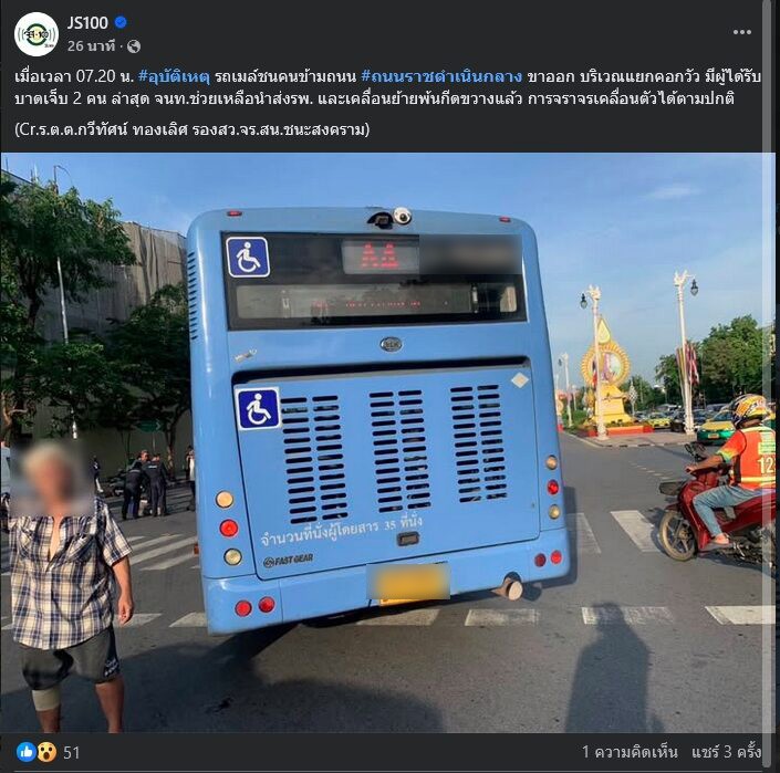 เมื่อวันที่ 20 ตุลาคม 2568 ว่า เพจ JS100 ได้โพสต์แจ้งเหตุอุบัติเหตุ เมื่อเวลาประมาณ 07.20 น. บริเวณถนนราชดำเนินกลาง ขาออก บริเวณแยกคอกวัว โดยมีรายละเอียดว่า รถเมล์ได้เฉี่ยวชนกับคนข้ามถนน จนมีผู้ได้รับบาดเจ็บจำนวน 2 ราย