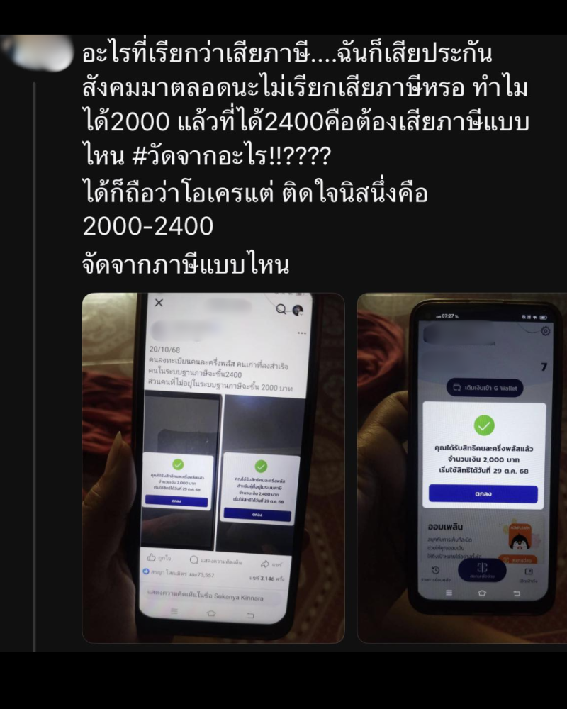 เมื่อวันที่ 20 ตุลาคม 2568 เกิดกระแสวิพากษ์ในโลกออนไลน์ หลังจากหญิงรายหนึ่งโพสต์แสดงความไม่พอใจเกี่ยวกับการได้รับสิทธิในโครงการ คนละครึ่งพลัส เพียง 2,000 บาท โดยตั้งคำถามว่า ฉันก็จ่ายประกันสังคมมาตลอด ทำไมไม่ถือว่าเสียภาษี แล้วคนที่ได้ 2,400 ต้องเสียภาษีแบบไหน วัดจากอะไร