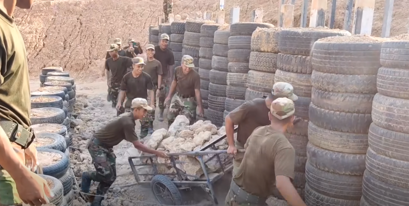 ในคลิปปรากฏภาพทหารกำลังช่วยกันขนหินไปวางเรียงบนยางรถยนต์ที่จัดวางเป็นแนวกำแพง และยังมีการขุดดินเป็นหลุมขนาดใหญ่ รวมถึงการเร่งบรรจุดินลงในกระสอบ เพื่อนำไปใช้เสริมความแข็งแรงของบังเกอร์อีกด้วย