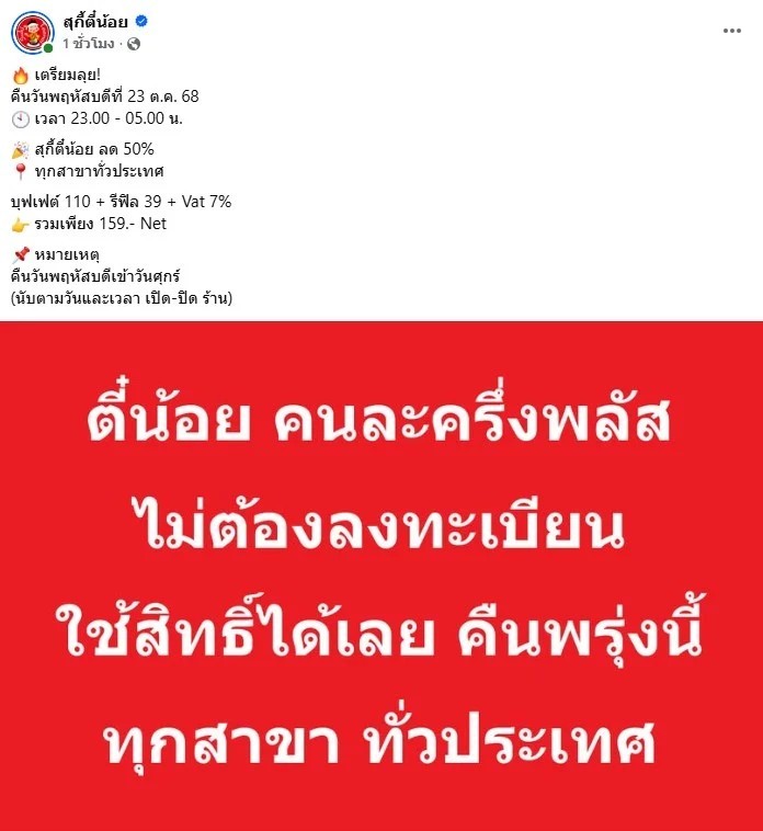 เมื่อวันที่ 22 ตุลาคม 2568 สุกี้ตี๋น้อย ร้านสุกี้บุฟเฟต์ชื่อดัง ออกมาประกาศโปรโมชั่นสุดพิเศษ รับกระแสความร้อนแรงของโครงการ คนละครึ่งพลัส ที่เพิ่งปิดลงทะเบียนไป โดยจัดเวอร์ชันของตนเองแบบไม่ต้องลงทะเบียนให้ยุ่งยาก ลดราคาทันที 50% ทุกสาขาทั่วประเทศ
