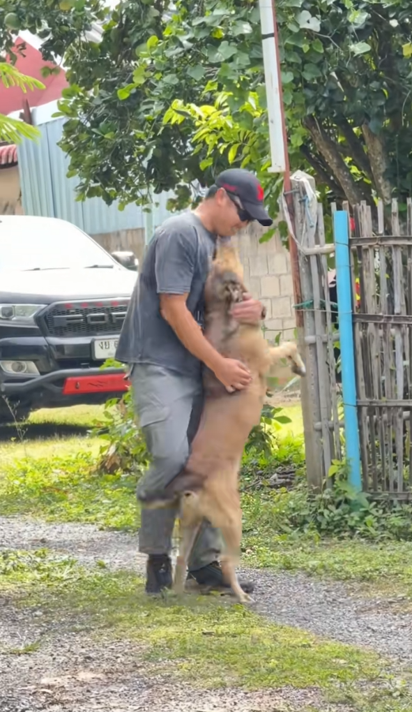ตอนแรกเจ้าหมาดูเหมือนจะยังไม่แน่ใจ จึงค่อยๆ เดินเข้าไป แต่พอมั่นใจว่าเป็นคุณพ่อจริงๆ ก็ถึงกับกระโดดโลดเต้นดีใจจนเก็บอาการไม่อยู่ คุณแม่เล่าว่า เจ้าหมาตัวนี้ติดคุณพ่อมาก จึงอยากลองแกล้งมันดูด้วยการให้คุณพ่อเข้าบ้านแบบไม่ให้รู้ตัวตามที่เห็นในคลิป ซึ่งผลลัพธ์ก็ออกมาน่ารักและอบอุ่นหัวใจสุดๆ