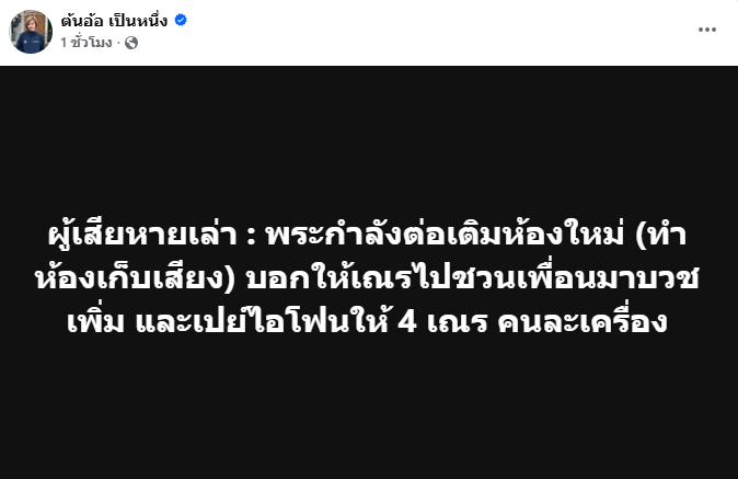 ทั้งนี้ ผู้เสียหายให้การเพิ่มเติมว่า พระรูปดังกล่าวเคยสั่งต่อเติมห้องใหม่ในวัด โดยระบุว่าเป็น ห้องเก็บเสียง พร้อมบอกให้เณรไปชวนเพื่อนมาบวชเพิ่ม และยังซื้อโทรศัพท์ไอโฟนให้สามเณรทั้ง 4 รูป คนละเครื่อง