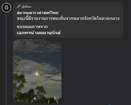 โดยในคอมเมนต์มีคนเข้ามาแสดงความคิดเห็นจำนวนมาก และพูดถึงลูกไฟที่เพิ่งเห็นบนท้องฟ้า พร้อมกับเสียงระเบิดดังสนั่น โดยเฉพาะในพื้นที่ภาคกลาง บางคนบอกว่าเสียงระเบิดดังจนกำแพงสั่น หรือพื้นสั่น
