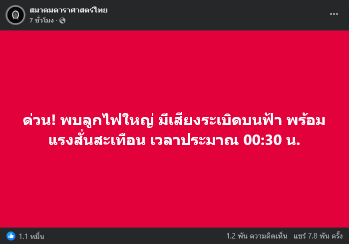 วันที่ 26 ตุลาคม 2568 เพจเฟซบุ๊ก สมาคมดาราศาสตร์ไทย รายงานว่า ด่วน! พบลูกไฟใหญ่ มีเสียงระเบิดบนฟ้า พร้อมแรงสั่นสะเทือน เวลาประมาณ 00:30 น.