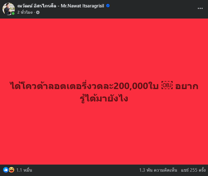 งานนี้ทำเอาโซเชียลแห่คอมเมนต์กันสนั่น หลัง บอส ณวัฒน์ ได้โพสต์ข้อความลงบนเฟซบุ๊กชื่อ ณวัฒน์ อิสรไกรศีล - Mr.Nawat Itsaragrisil ระบุว่า ได้โควต้าลอตเตอรี่งวดละ200,000ใบ อยากรู้ได้มายังไง