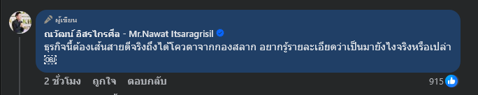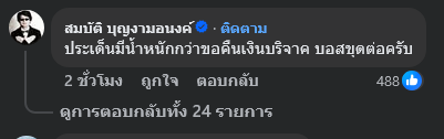 ด้าน สมบัติ บุญงามอนงค์ ก็เข้ามาคอมเมนต์เชียร์บอสด้วยว่า ประเด็นมีน้ำหนักกว่าขอคืนเงินบริจาค บอสขุดต่อครับ ท่ามกลางคอมเมนต์แสดงความคิดเห็นกันรัวๆ