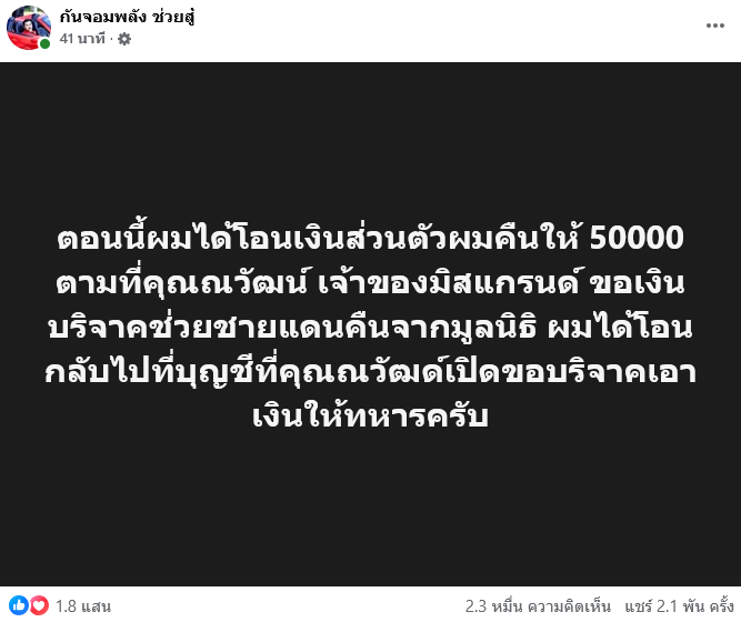 ล่าสุด เมื่อวันที่ 27 ตุลาคม 2568 กัน จอมพลัง ได้โพสต์ข้อความผ่านเพจเฟซบุ๊ก กันจอมพลัง ช่วยสู้ โดยระบุว่า ตอนนี้ผมได้โอนเงินส่วนตัวผมคืนให้ 50,000 ตามที่คุณณวัฒน์ เจ้าของมิสแกรนด์ ขอเงินบริจาคช่วยชายแดนคืนจากมูลนิธิ ผมได้โอนกลับไป ที่บุญชีที่คุณณวัฒด์เปิดขอบริจาค เอาเงินให้ทหารครับ